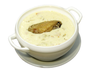 крыло цыпленка, сыр плавленный, картофель свежий, лук репчат., морковь св., сливки, соль, перец черный молотый, лавровый лист