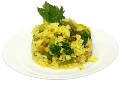 крупа рис., горошек конс., капуста брокколи, куркума, морковь св., перец св., соль, соус соевый, фасоль спаржевая, чеснок св.