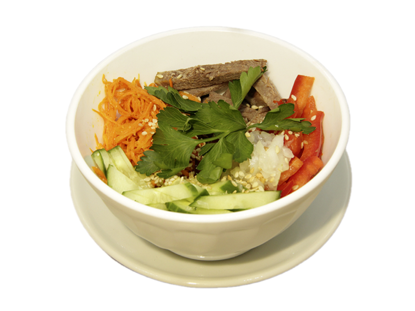 говядина тазоб.часть, огурцы св., морковь пикантная, перец св., пряный корейский соус, кунжут, лук маринованный